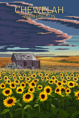 Chewelah, Washington - Painterly - Wheat Fields - Shack & Sunflowers